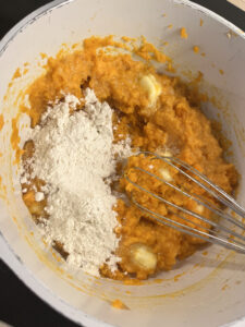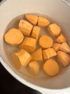 - Eplucher les patates douces, les couper en cubes et faire cuire dans l’eau bouillante 45 minutes. Egoutter et réserver.