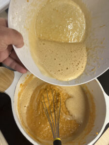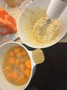 - Dans un grand mixeur, mixer la chair de patate douce, puis ajouter le mélange liquide
